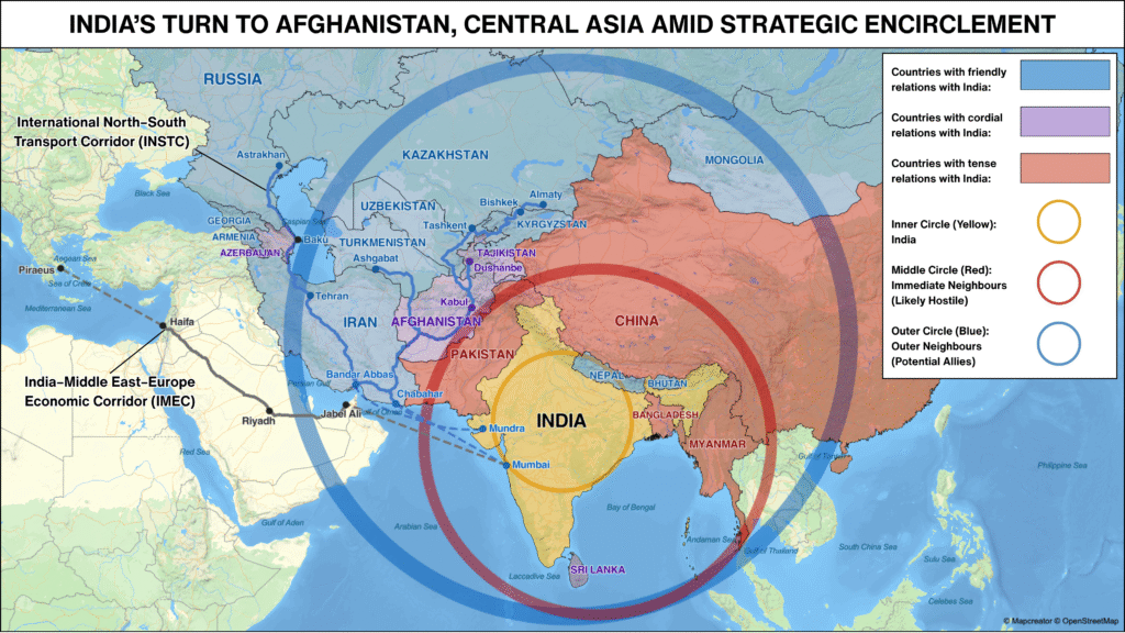 The map illustrates India’s growing outreach to Afghanistan and Central Asia as part of its strategy to counter regional isolation, seeking allies beyond its immediate neighborhood amid tense relations with China and Pakistan.