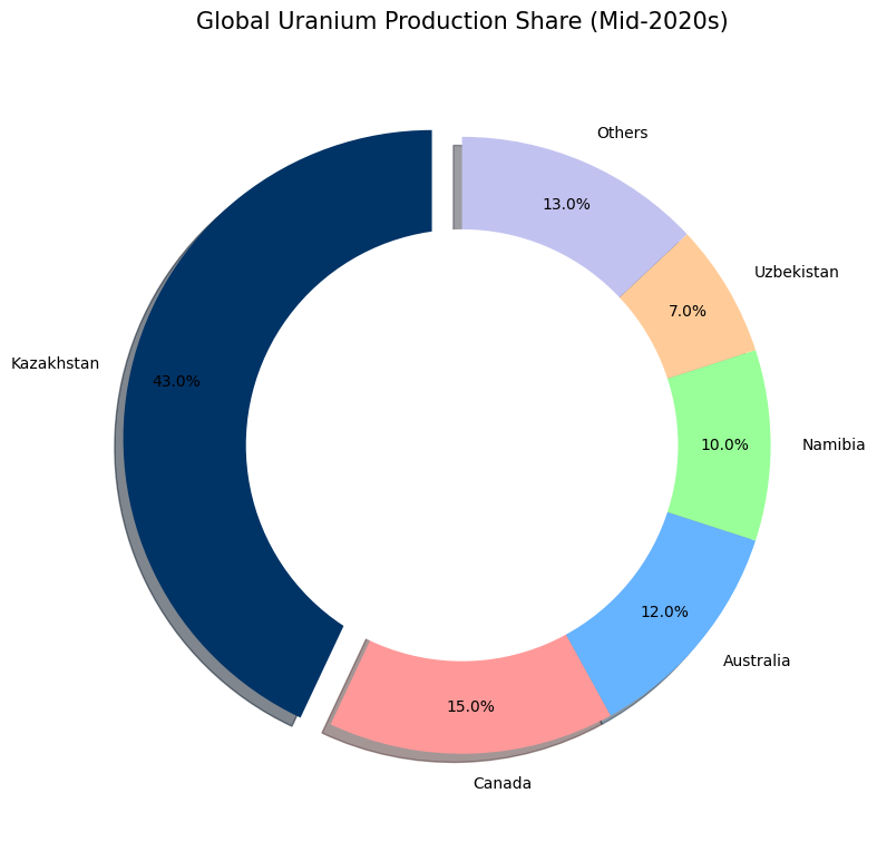 Kazakhstan alone accounts for roughly 12–15 percent of known global uranium resources and produces about 40 percent of annual global uranium output, making it the undisputed backbone of world supply.