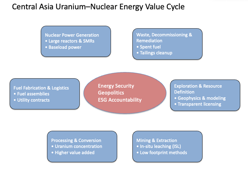 In this context, Central Asia’s role is outsized. Kazakhstan’s low-cost in-situ leaching (ISL) operations place it at the bottom of the global cost curve, giving it price-setting power during periods of supply tightness. Uzbekistan’s strategy to expand exploration and improve recovery rates could further consolidate the region’s importance. By contrast, uranium resources in Kyrgyzstan and Tajikistan are modest in global terms, but their geopolitical and environmental significance is high due to legacy contamination and their potential re-entry into the market under new regulatory regimes. The key point is that Central Asia is not a marginal supplier. It is a systemically important player in the global nuclear fuel cycle, and shifts in its production, governance, or export orientation have global repercussions.