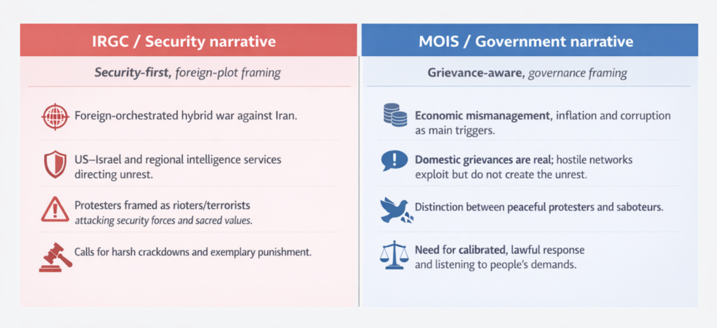 By contrast, the MOIS (The Ministry of Intelligence and Security) and government camp blames economic mismanagement and corruption. They acknowledge domestic grievances but warn that hostile networks are exploiting the situation. This camp distinguishes between peaceful protesters and saboteurs. Consequently, they call for a calibrated, lawful response and occasionally suggest listening to the people’s demands.