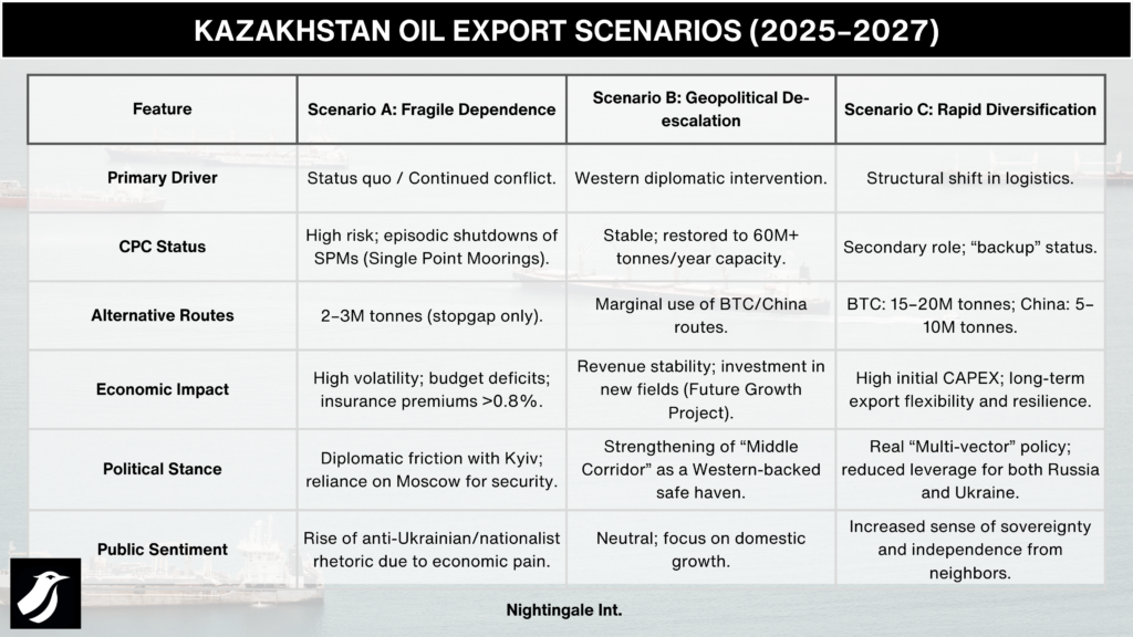 Based on our analysis of regional energy security and evolving geopolitical risks, we have developed three strategic scenarios for Kazakhstan’s oil exports through 2027. The following table compares these pathways, outlining the specific indicators and long-term consequences to help visualize the shift from dependence toward diversification.