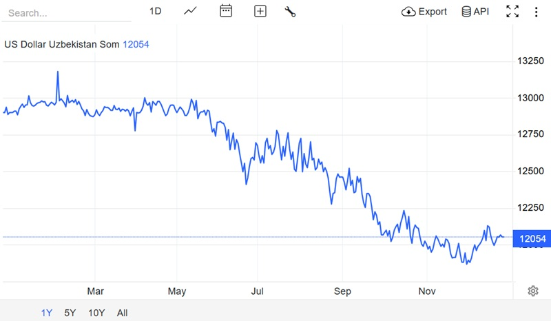 Historically weakened by inflation and devaluation, the Uzbek som gained ground against the dollar in the second half of the year. The currency strengthened by roughly 7% over the last 12 months, improving from 12,519 per dollar in April to 11,955 by December.